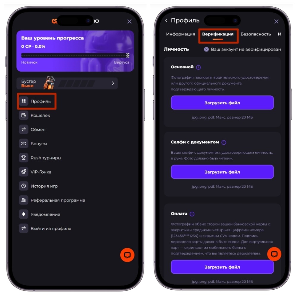 Стандартная верификация включает в себя подтверждение личности. Игроку нужно предоставить фотографии паспорта, ID-карты или другого официального удостоверения.